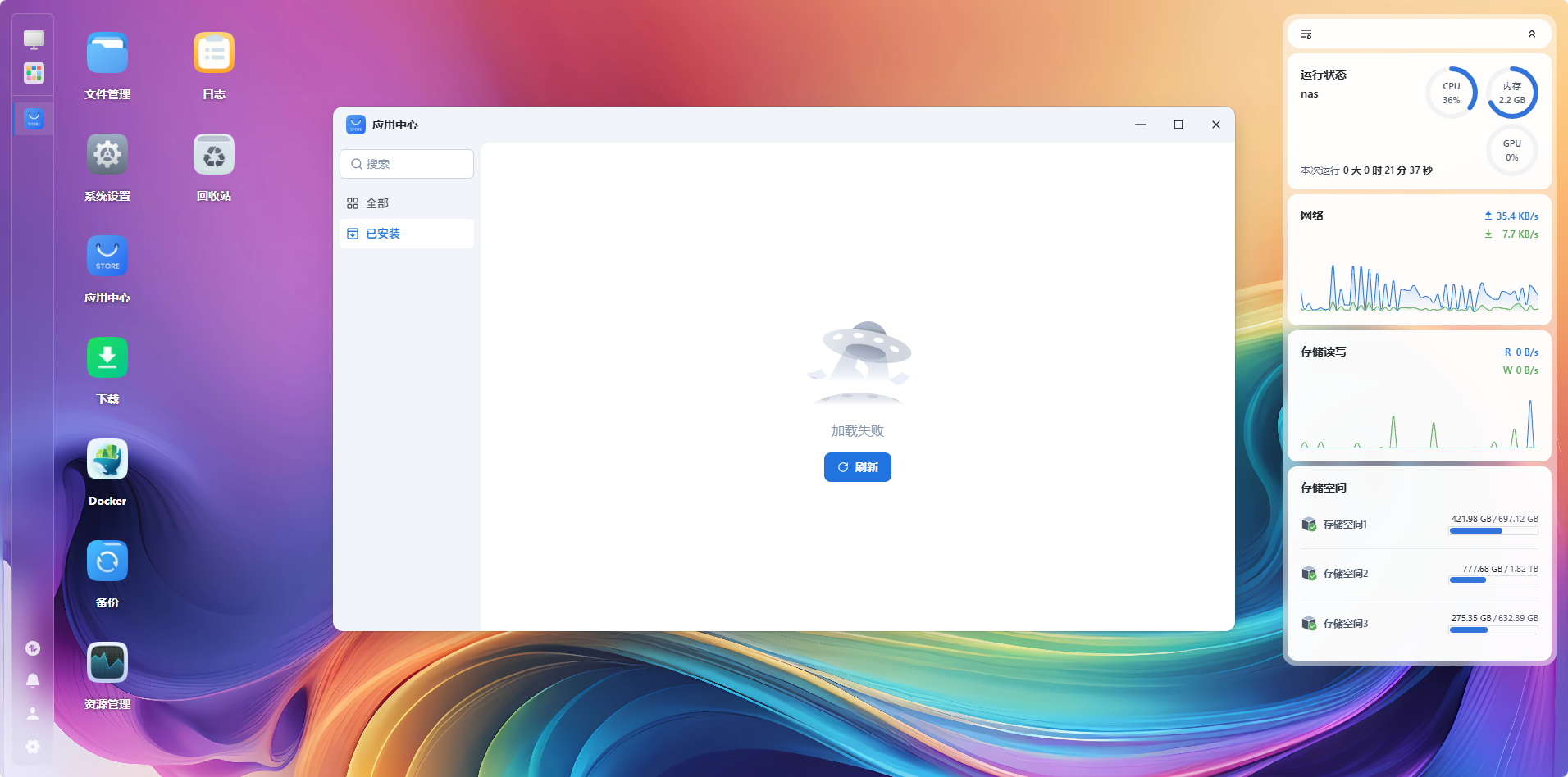 昨天已经尝试更新系统了,更新一天了还是这样,重启之后应用中心变成图二这样了,再次点击更新还是卡住