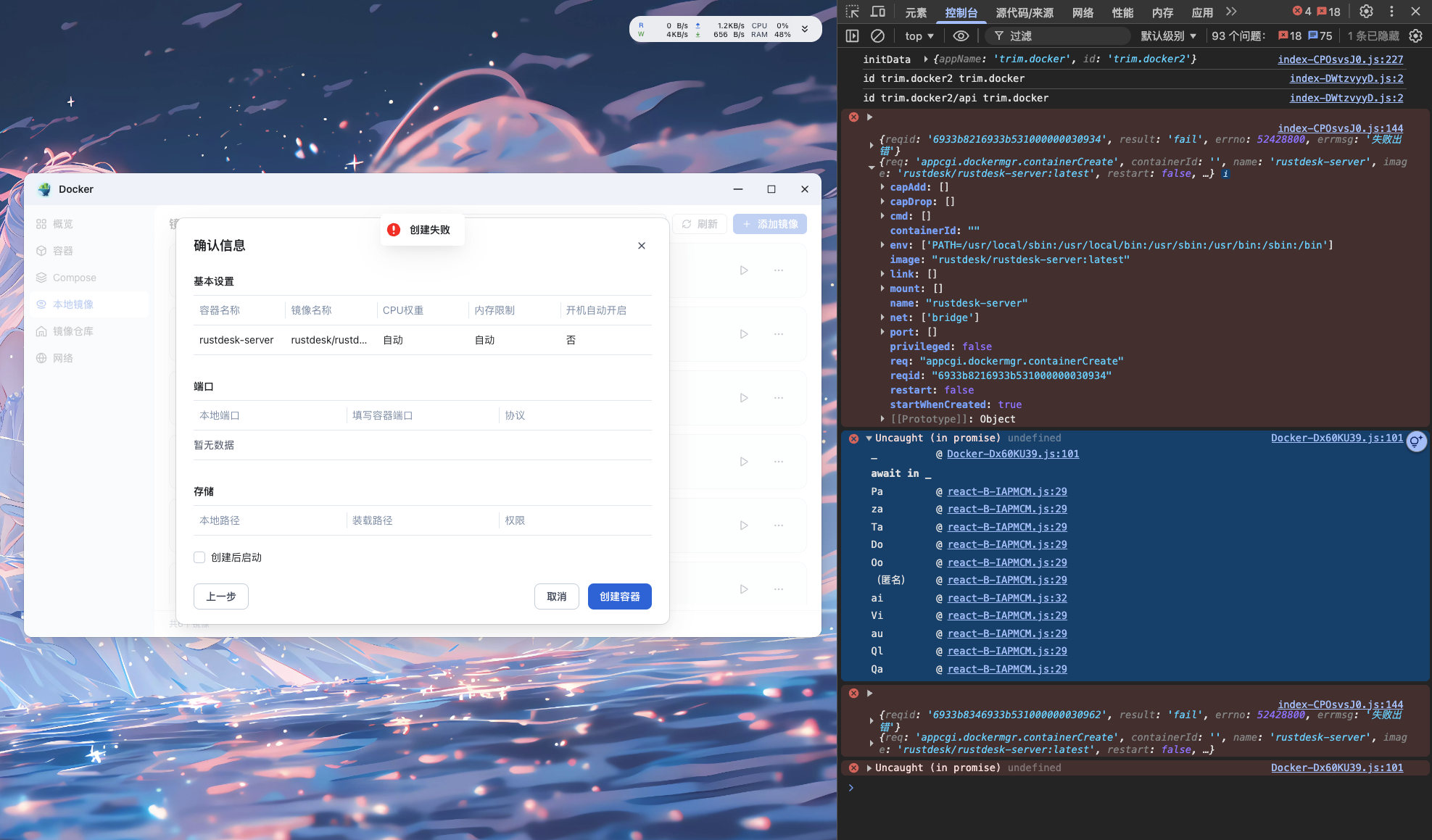 2.docker创建容器失败;警告内容无意义,无法定位问题;例如rustdesk/rustdesk-server镜像创建容器时