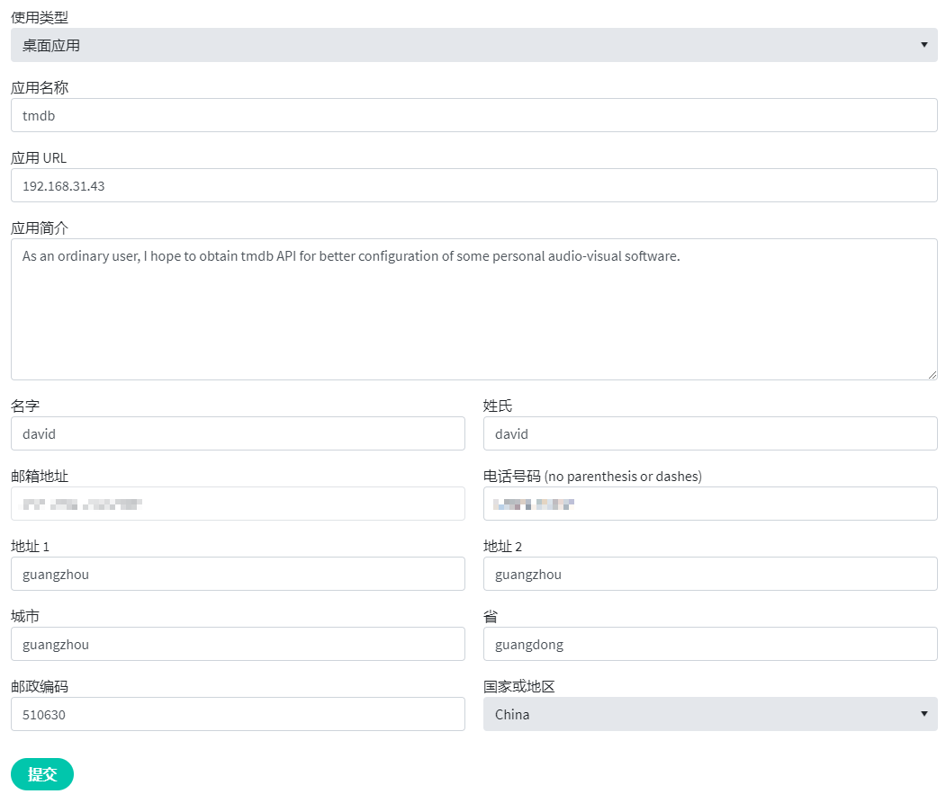 应用简介随便填写:As an ordinary user, I hope to obtain tmdb API for better configuration of some personal audio-visual software.
