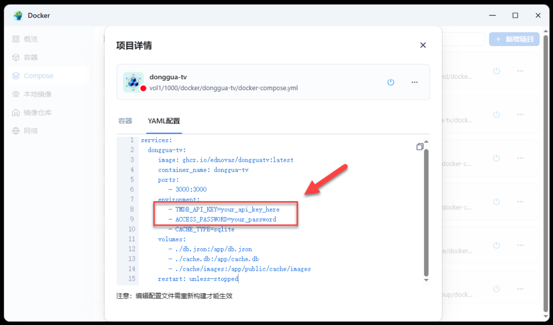 创建项目,根据实际情况修改 TMDB_API_KEY 和 ACCESS_PASSWORD 两个环境变量的值
