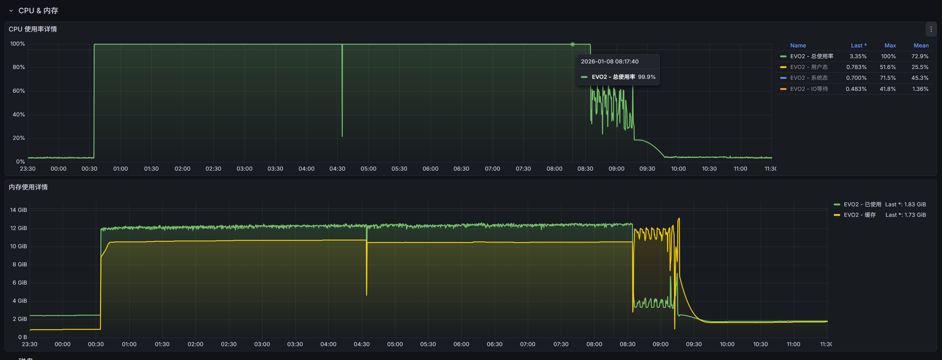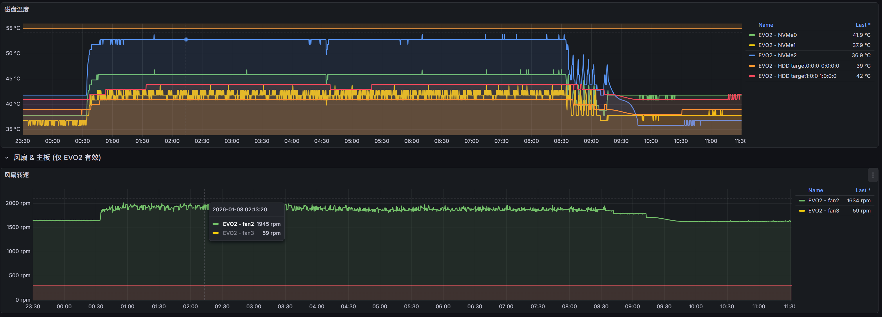 昨晚拿两块32T(未上市)的氦气企业盘,与两块8T固态这种最极限的硬盘使用环境,在室温30度的机房里面对EVO2进行双烤压测 (除了硬盘满载读写之外,对CPU也进行满载烤机,这个会比该博主的测试压力更大)。我们可以看看实际的CPU核心温度与硬盘温度,都在健康的范围内。