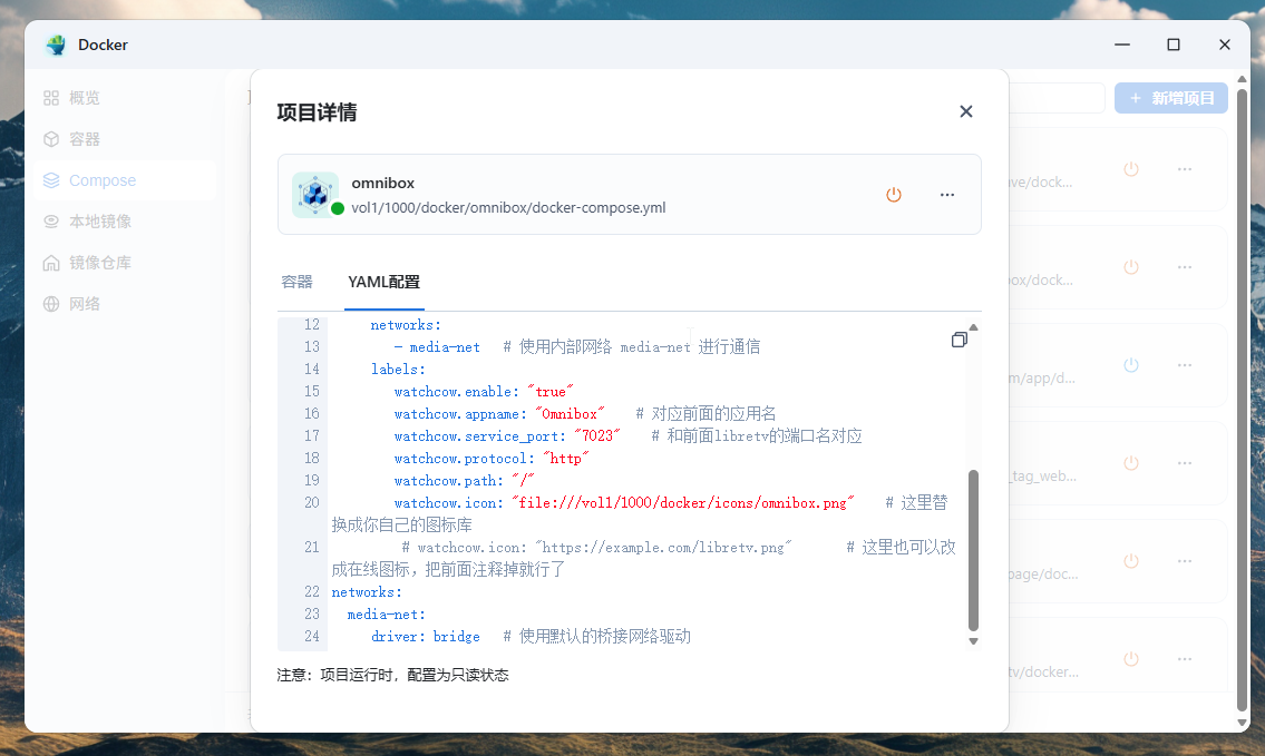 labels: watchcow.enable: "true" watchcow.appname: "Omnibox" # 对应前面的应用名 watchcow.service_port: "7023" # 和前面libretv的端口名对应 watchcow.protocol: "http" watchcow.path: "/" watchcow.icon: "file:///vol1/1000/docker/icons/omnibox.png" # 这里替换成你自己的图标库 # watchcow.icon: "https://example.com/libretv.png" # 这里也可以改成在线图标,把前面注释掉就行了