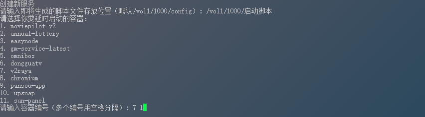 4️⃣填入你要延时启动的容器,输入对应的 序号 就行,中间用空格隔开,在前面的优先启动,按顺序启动,不设置的容器可以不填进去