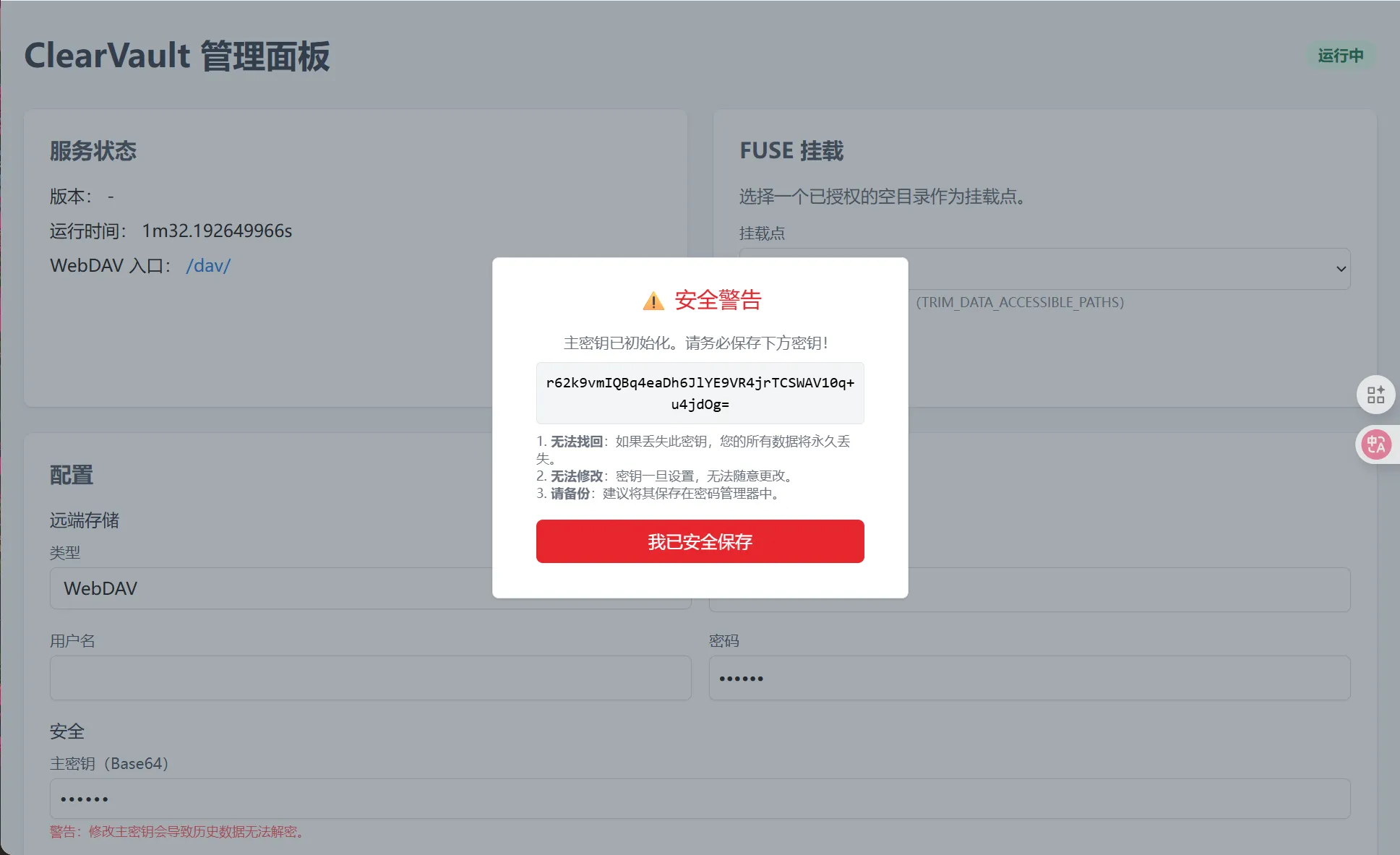 • 系统将生成并显示一串 主密钥(Base64格式)请立即将其复制并保存到安全的地方(如密码管理器)。完成后点击“我已安全保存”。