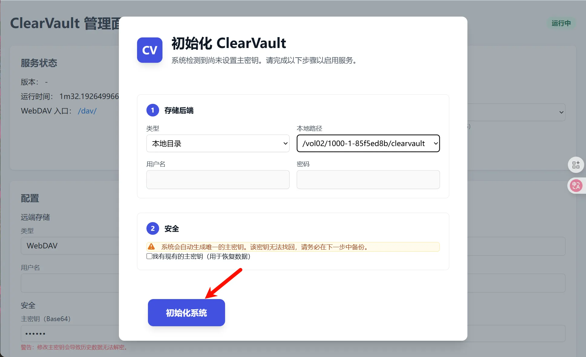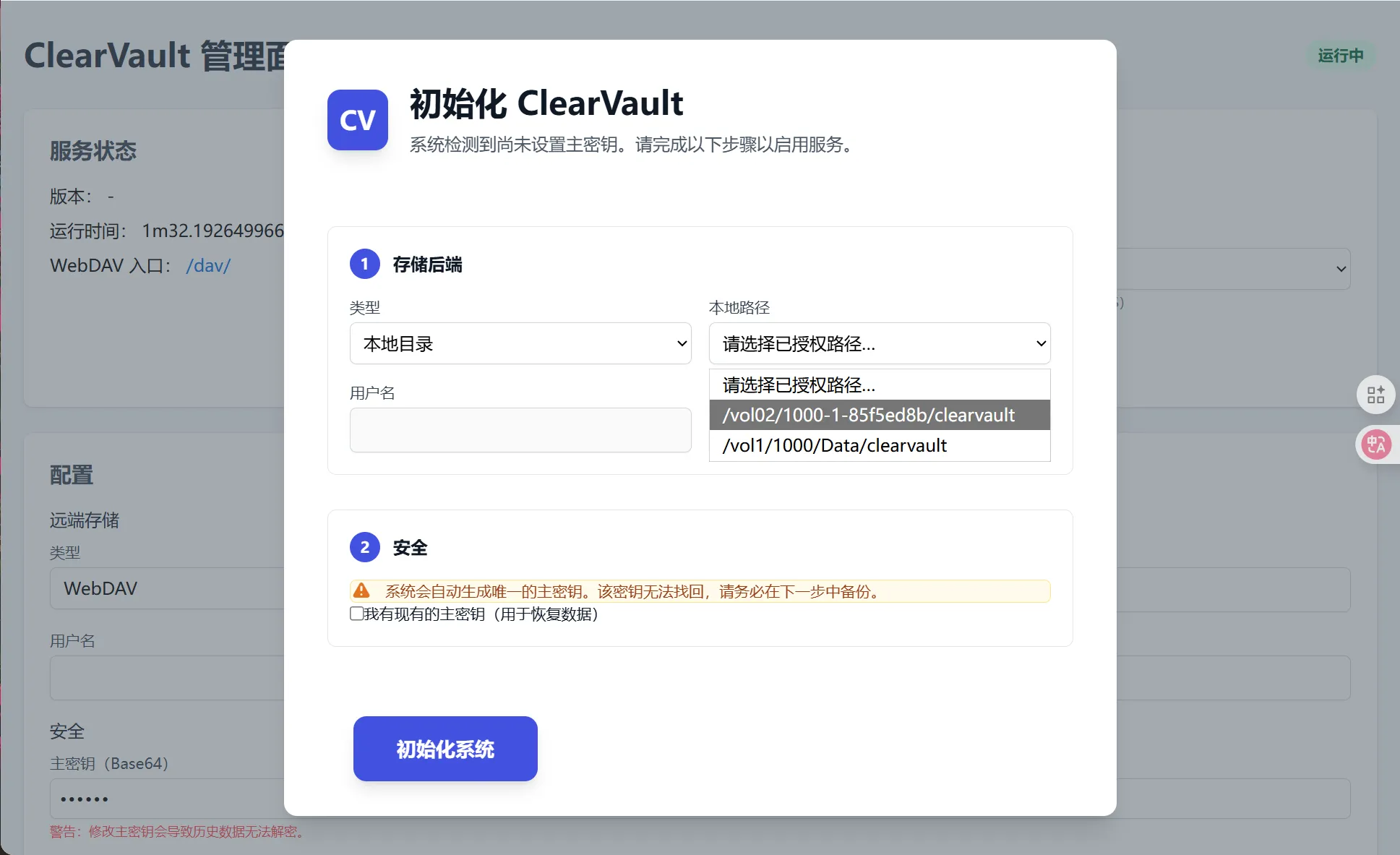 4. 初始化与挂载:通过 Web 管理界面完成系统初始化,并启动本地目录挂载。