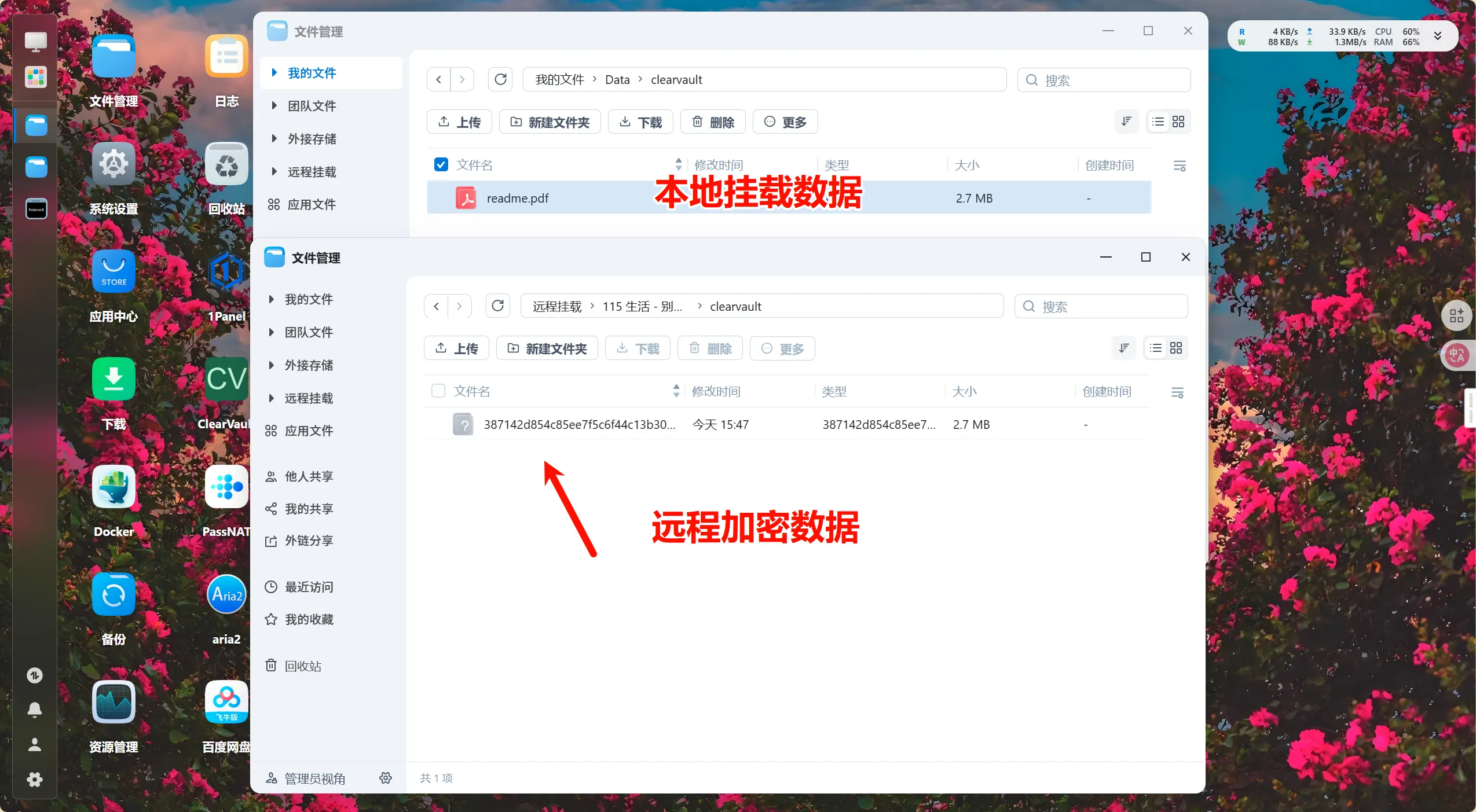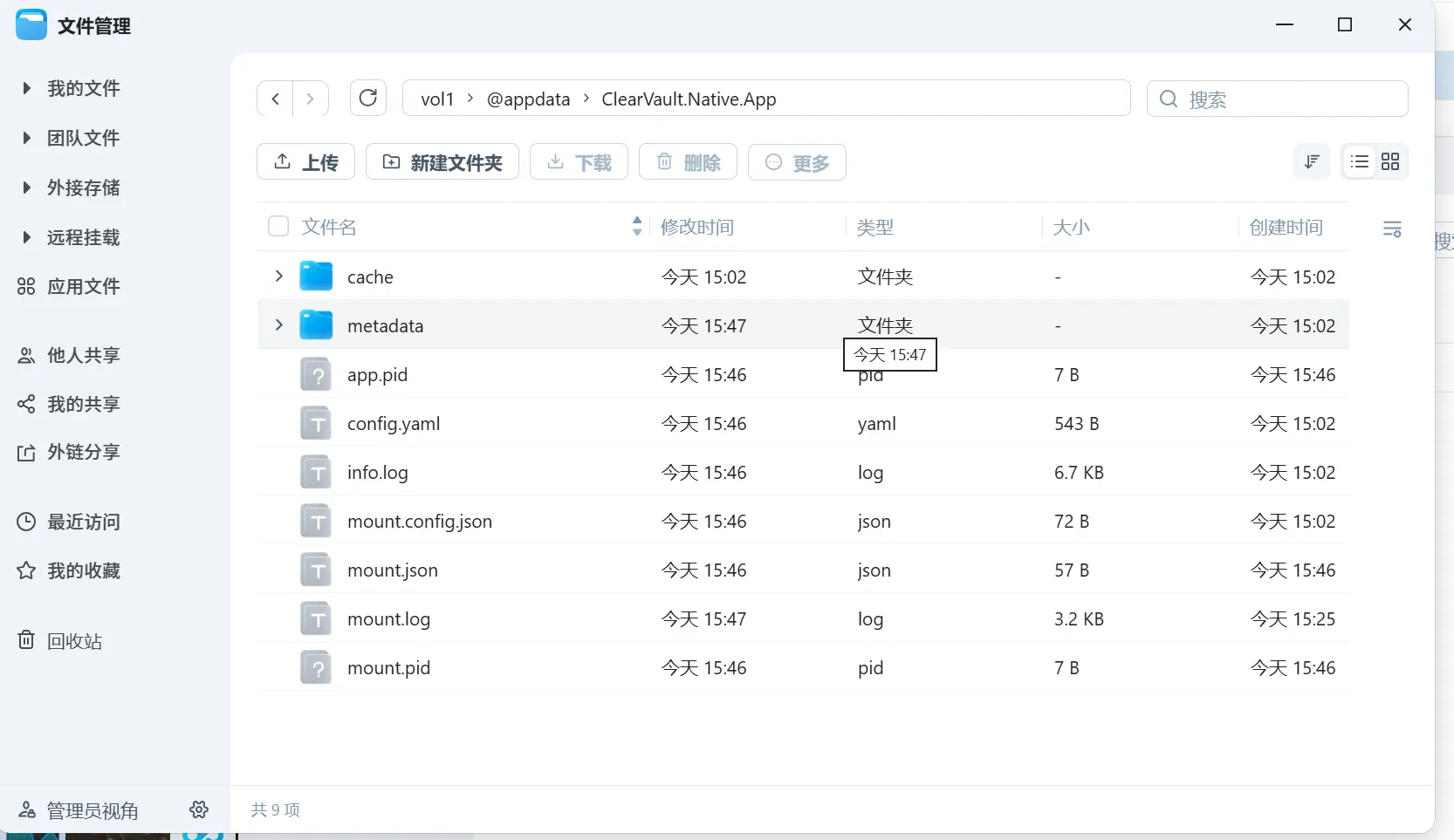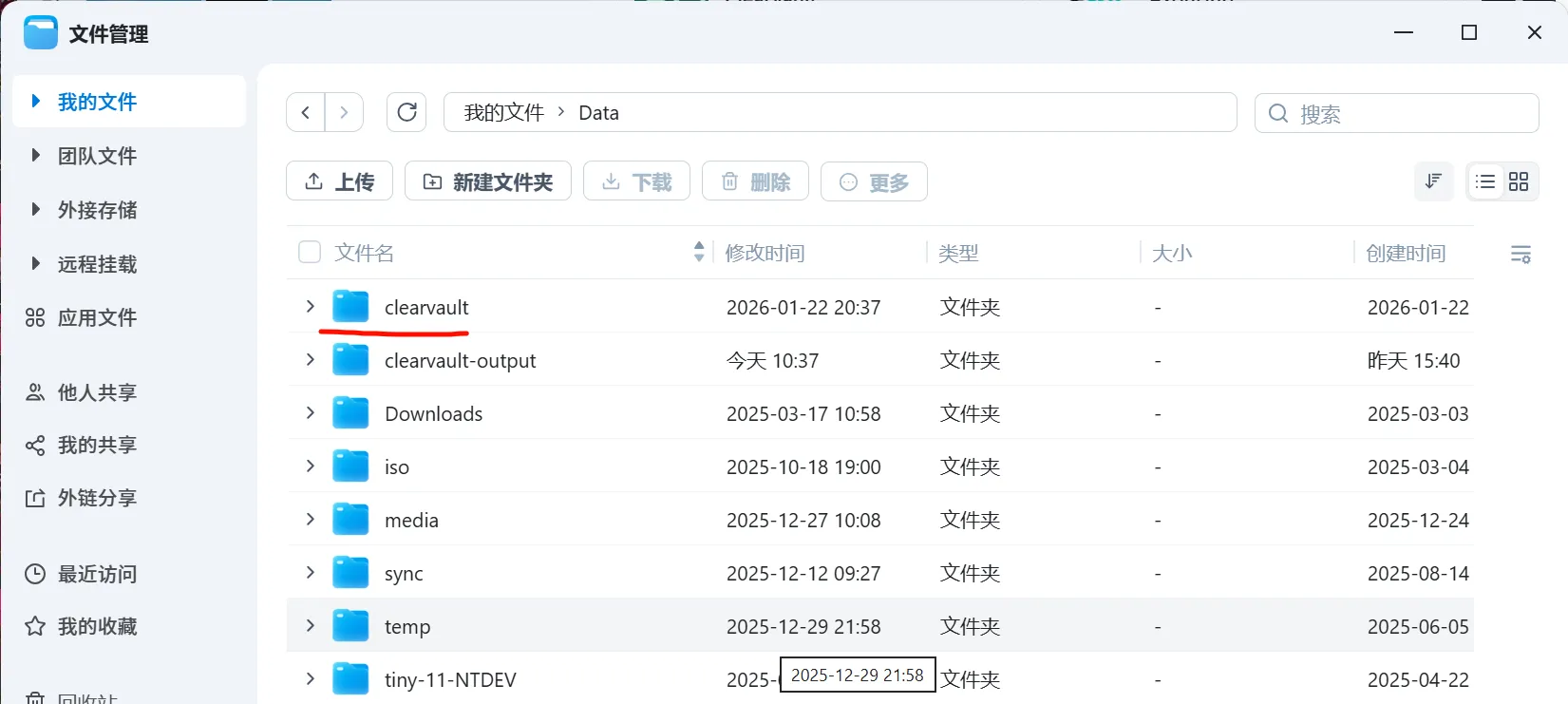 现在,您可以直接在飞牛 OS 的 “文件管理” 中,访问您挂载的本地目录(例如 /我的文件/Data/clearvault )。