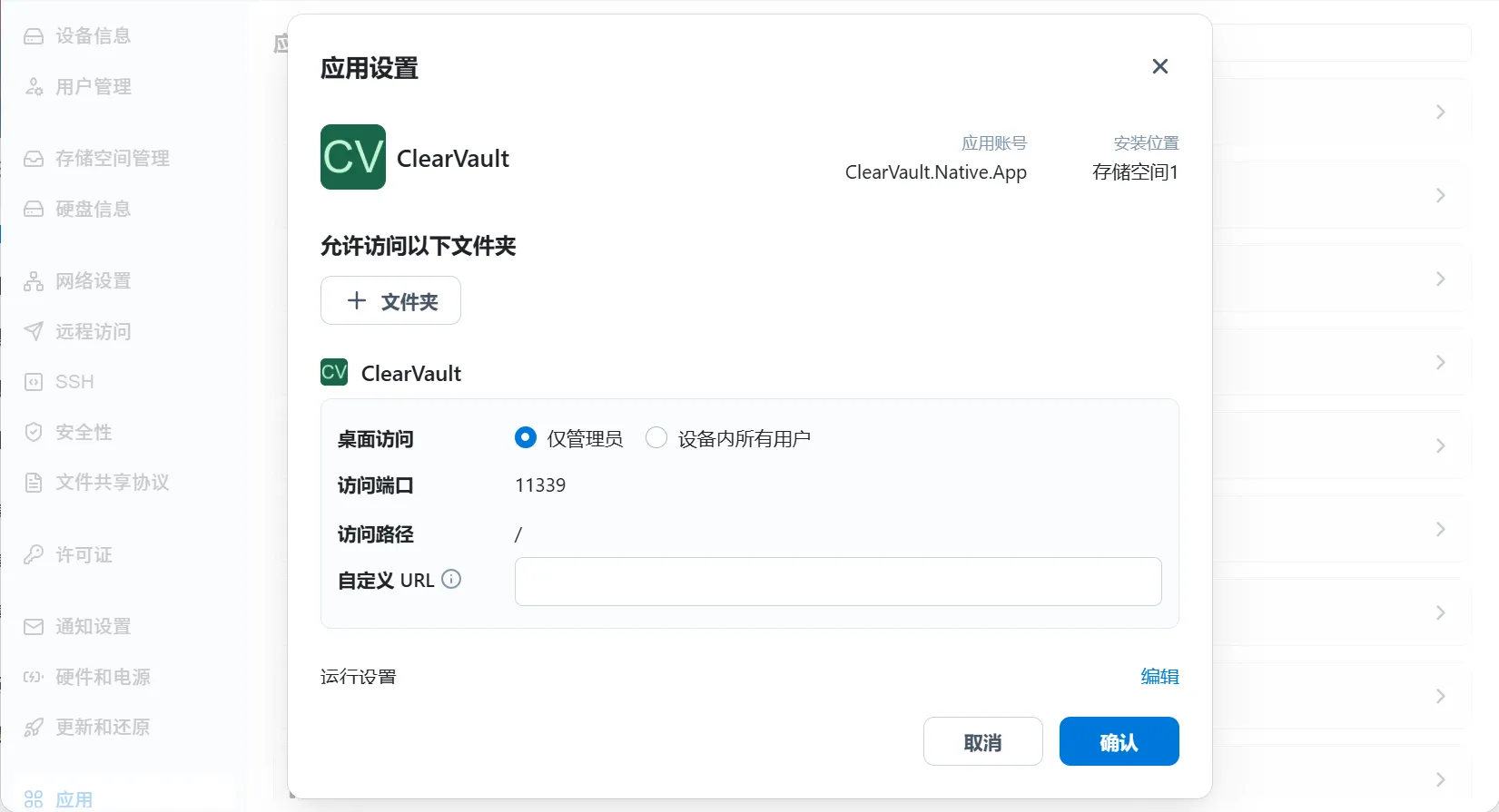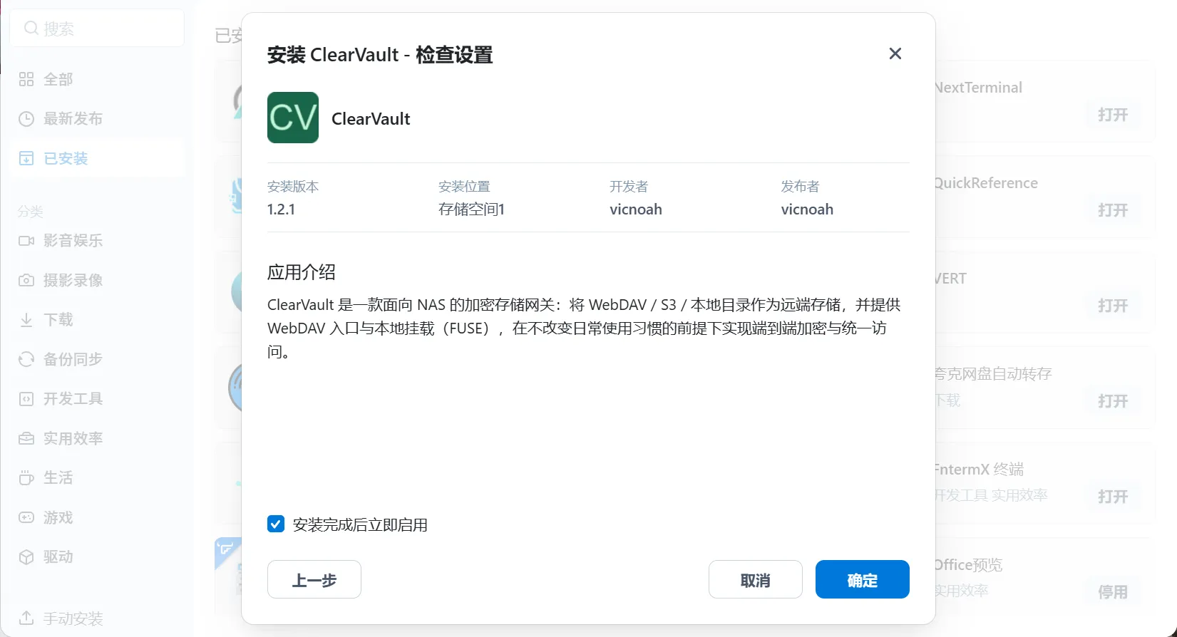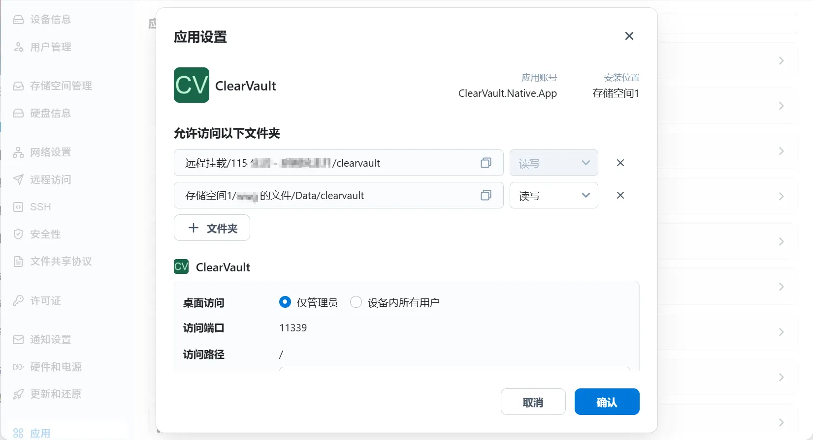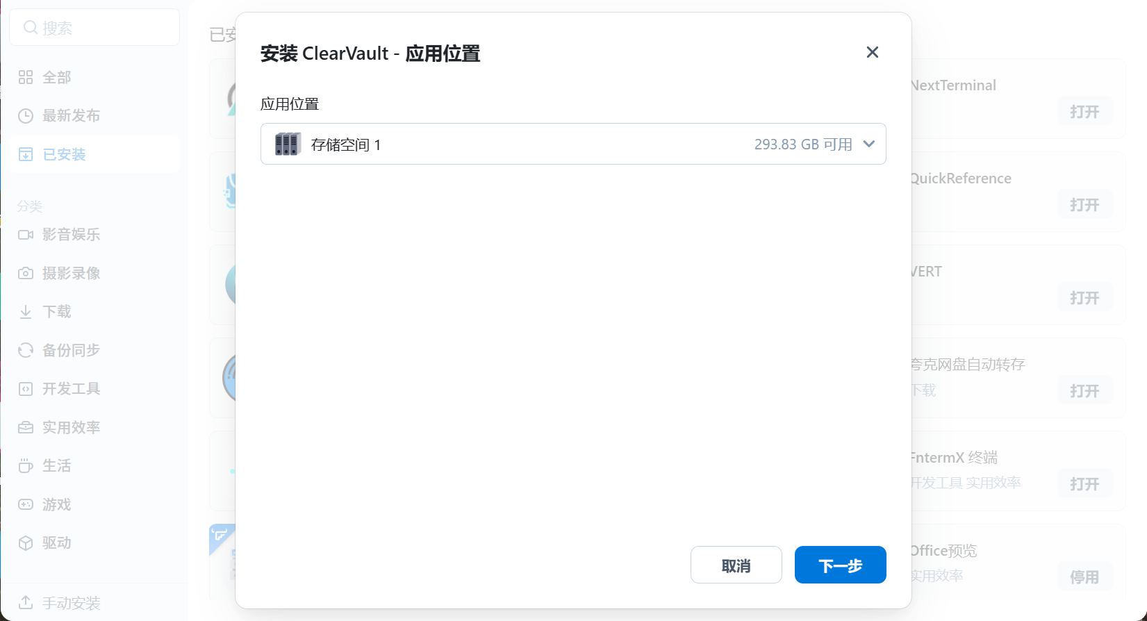 2. 点击安装。您可以选择应用的安装位置,这将决定其后端配置文件和元数据的存储路径(通常在 /volX/@appdata/ClearVault.Native.App/ 目录下)。