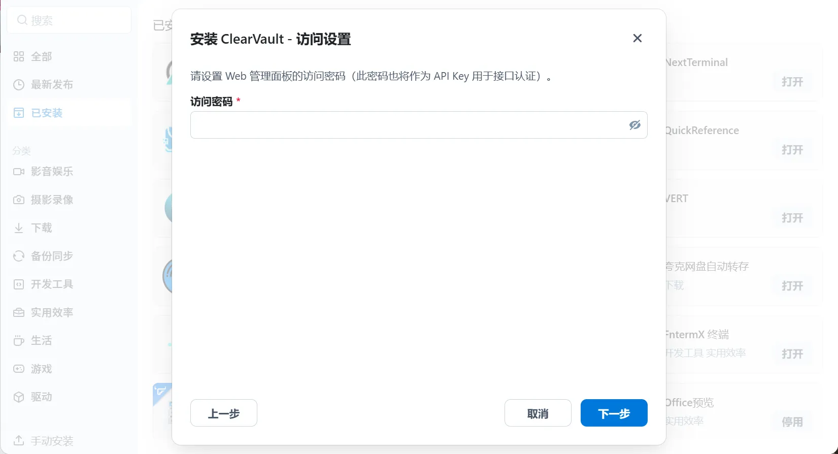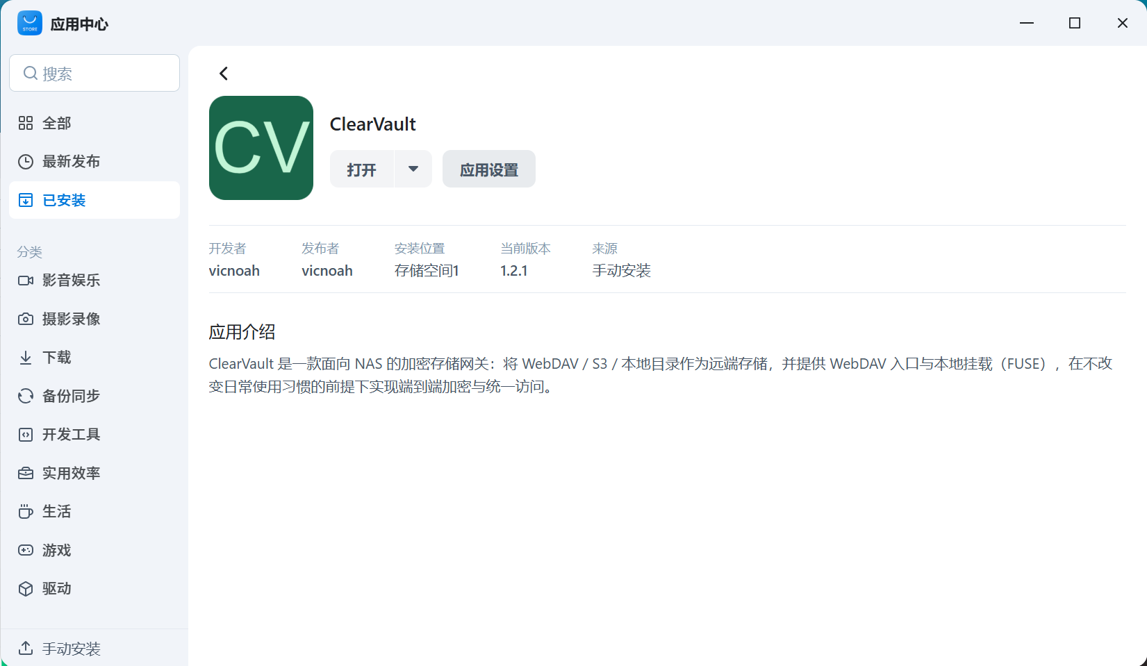 1. 在飞牛 OS 的 “应用中心” 搜索 “ClearVault”或手动上传安装。