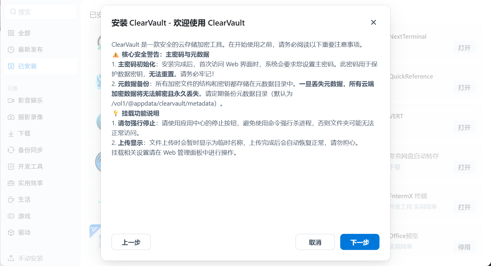 本指南将引导您在飞牛 OS 上快速完成 ClearVault 的安装、配置与挂载,让您立即开始安全地存储文件。