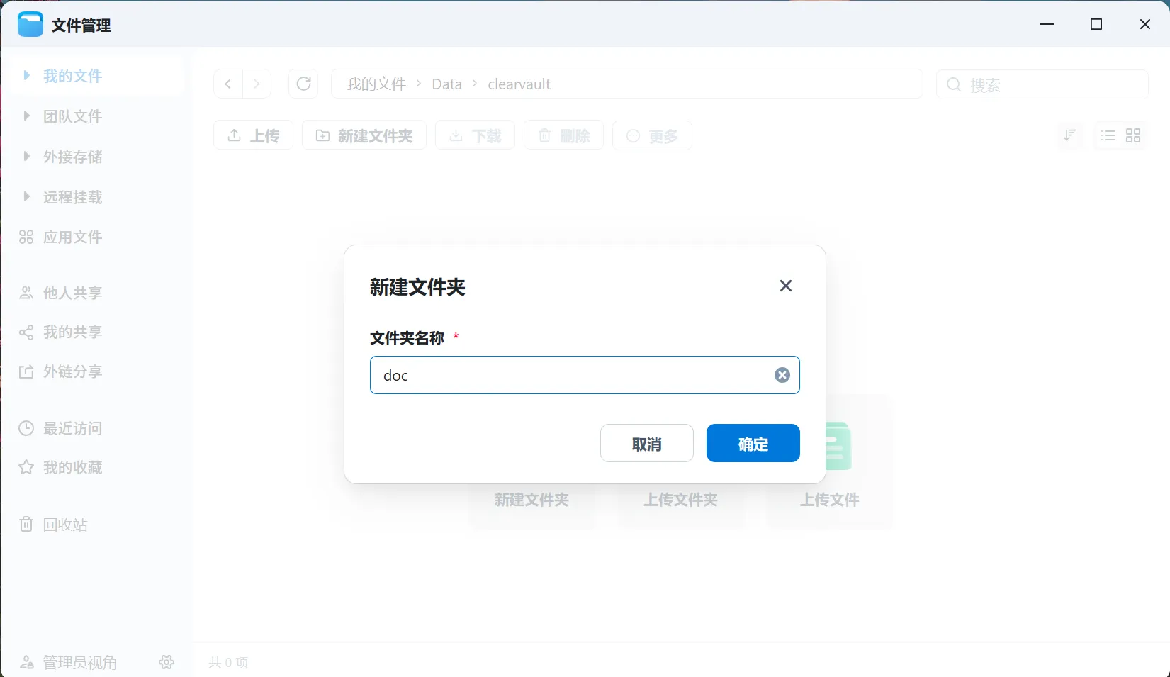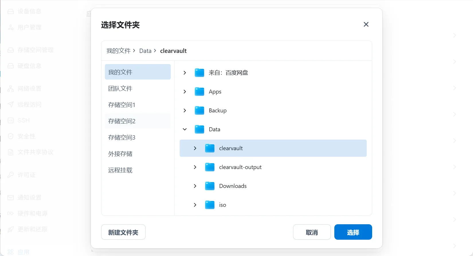 • 在飞牛 OS 的文件系统中,选择一个位置(例如 /我的文件/Data/clearvault ),创建一个全新的空文件夹