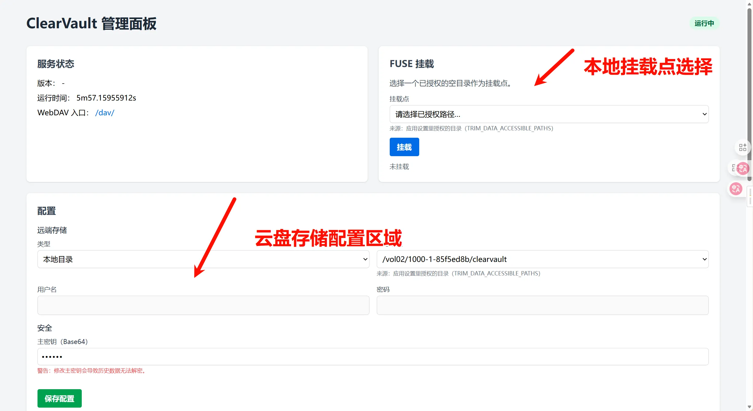 1. 远端存储路径(用于存放加密文件):推荐使用飞牛 OS 原生挂载的云盘路径。