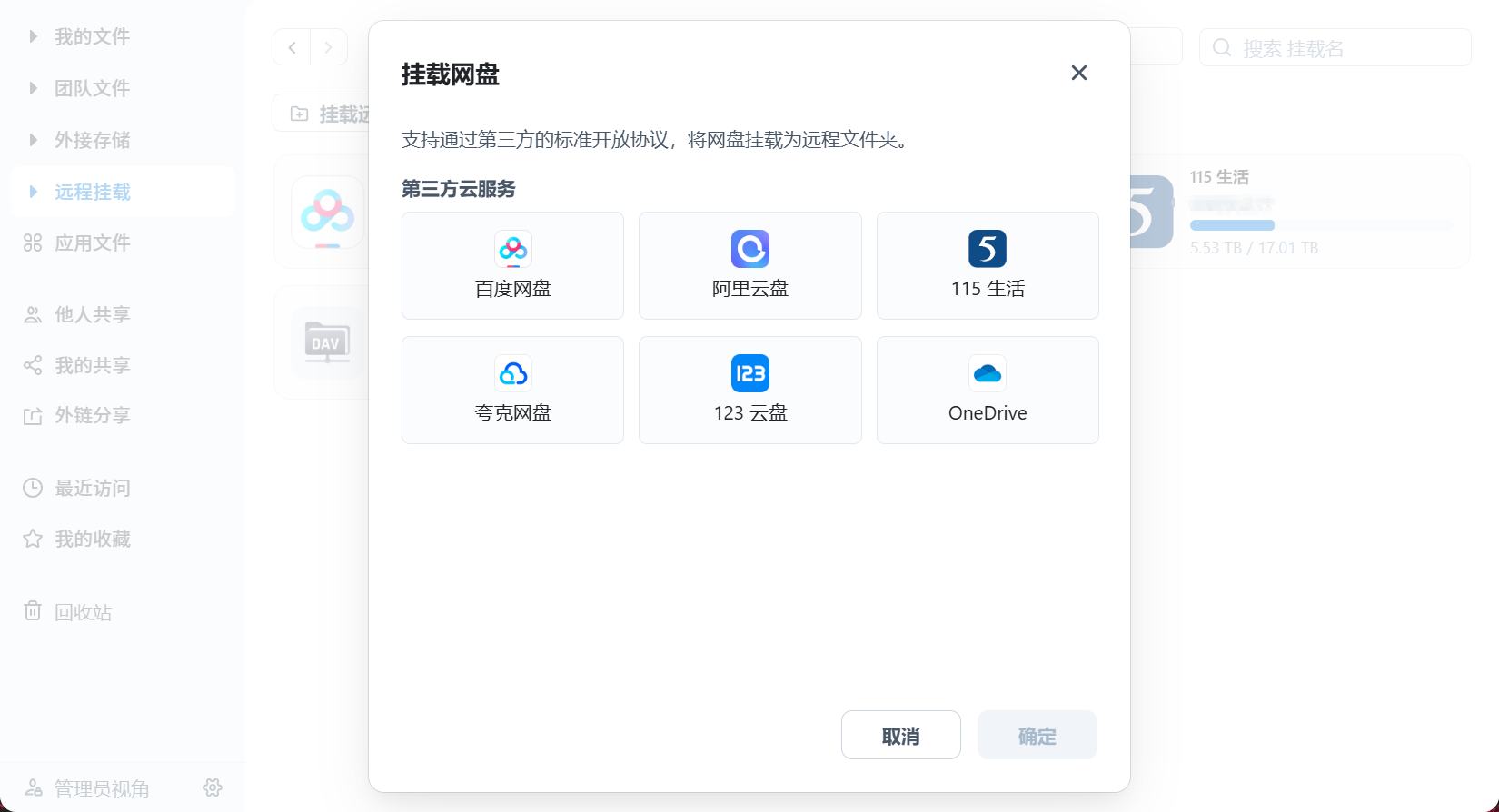 • 前往 “文件管理” → “外接存储”,按照飞牛官方指引挂载您的云盘(如阿里云盘、百度网盘等)。