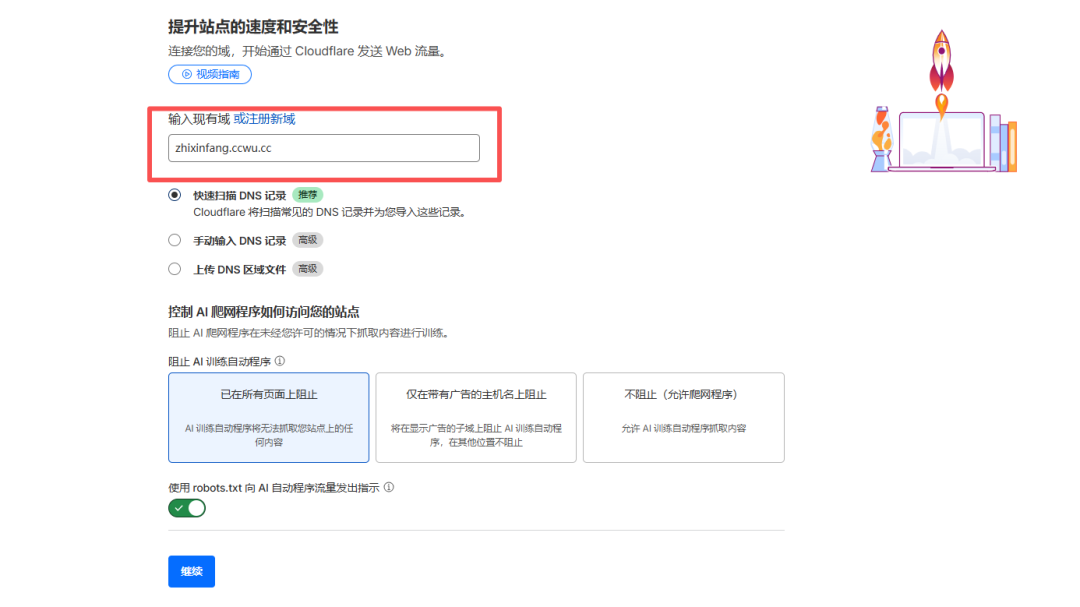 在下图我框起来的地方输入在dnshe注册好的域名,点击继续