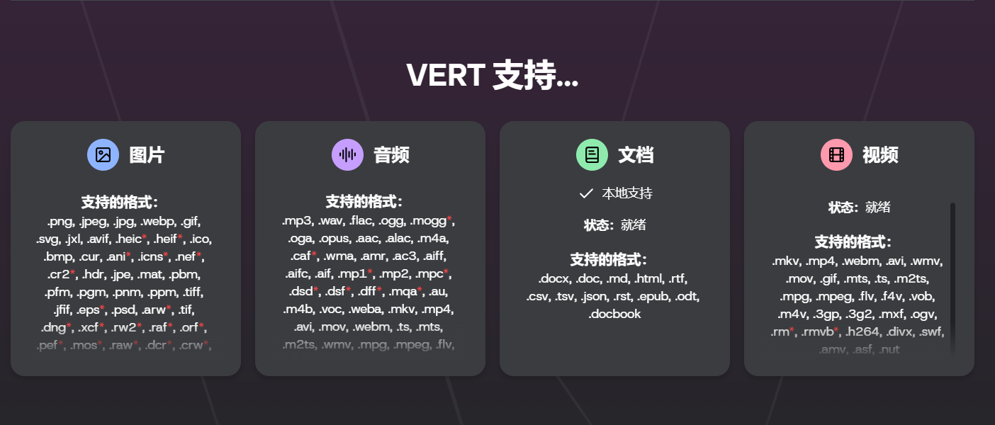 VERT 是一款开源自托管的全能文件格式转换器,无需安装客户端,浏览器打开即用。