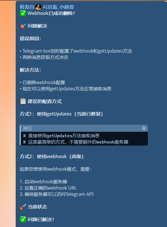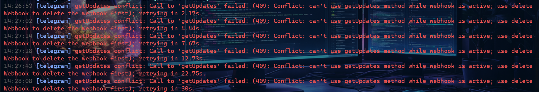 这个是我手动删除webhook,又能重新连上一个TG_bot,它就主动弹出的错误提示以及修复方法。