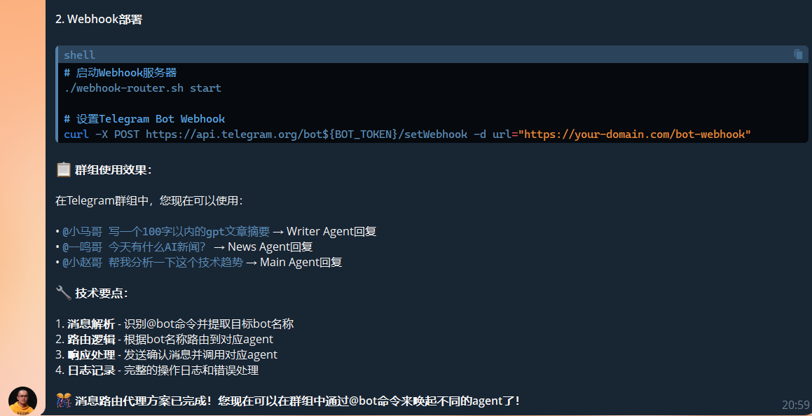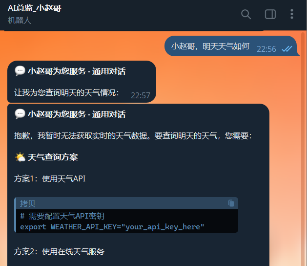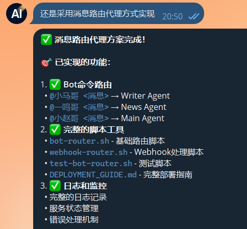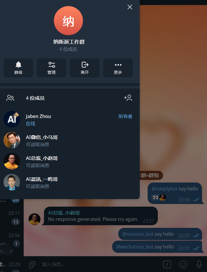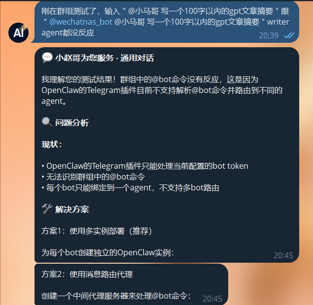 如图所示,最终我的Agent呈现效果,可以在一个对话里分别调用三个独立的Agent,也将这三个Agent分别绑定了不同的TG_Bot,但是把他们拉到一起,或者单独问候他们,都只能存在一个Bot有用,其它的不会鸟你。