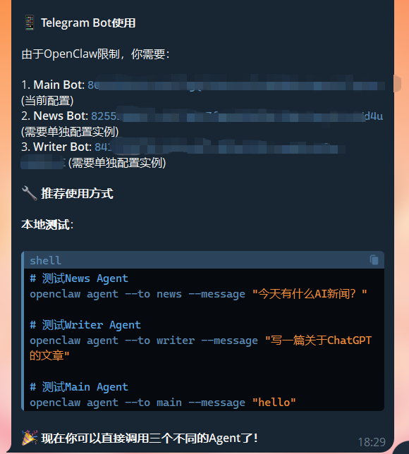 我看OpenClaw自己配置多Agent的方式跟那些文章讲的修改配置方式不太一样,原本我以为它也会按照那种方式自行去修改配置文件,我只需要提供TG_Bot_token就行,事与愿违,有可能是我对它输入的指令有问题,我的理解跟它的想法不一样。