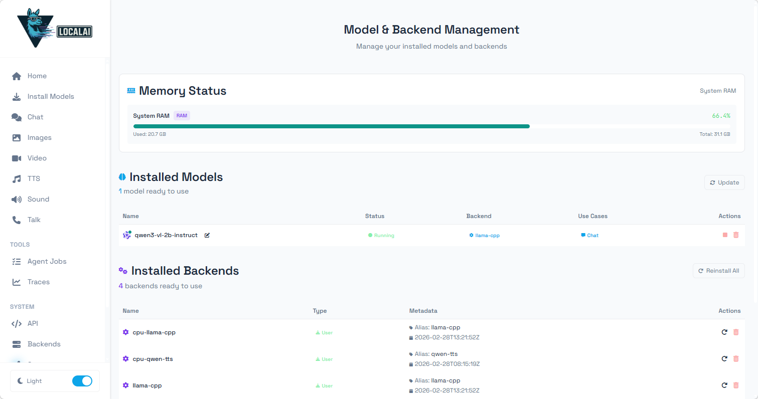 LocalAI 整体体验十分友好,可视化界面大幅降低了新手入门门槛。它支持完全本地化部署,断网环境下也能生成速度与质量俱佳的内容;仅靠纯 CPU 即可推理运行,无需依赖 GPU;同时兼容 OpenAI API 规范,现有应用可无缝迁移;模型支持 GGUF 格式,能快速下载各大厂商最新模型。对于需要轻量化本地 AI 推理、想快速体验大模型但缺乏高端硬件的用户,LocalAI 是一款非常值得尝试的工具。