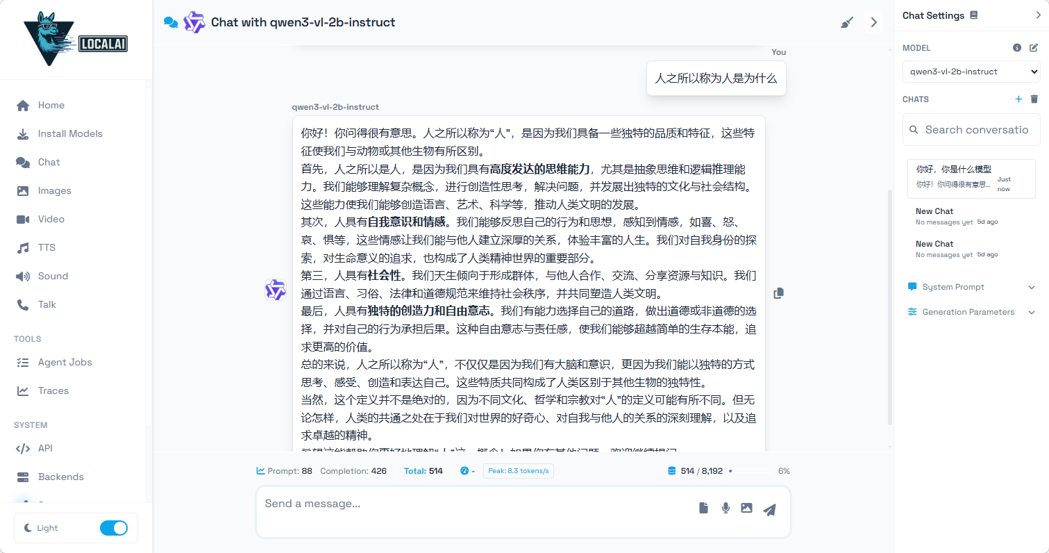 输入文字就能对话了,生成速度不是很快只有 3.4 tokens/s,但是体验也还不错