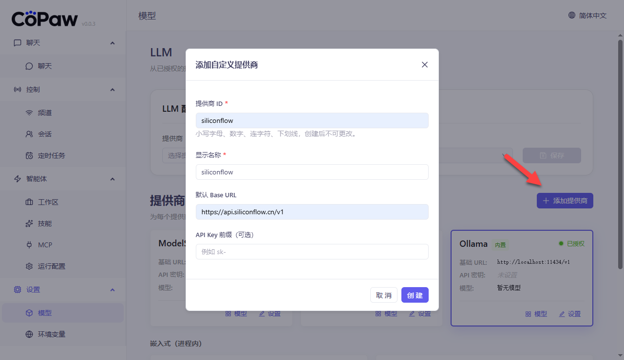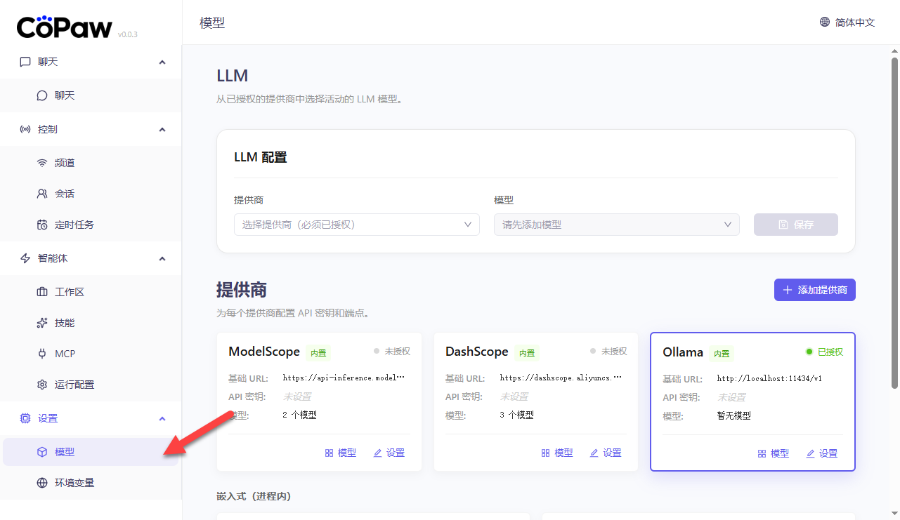 先到模型配置页面,支持本地内置 Ollama 和云端模型