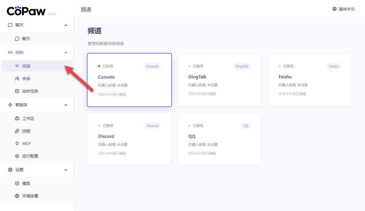 接下来就是对接频道,这样就能通过钉钉、飞书、QQ、Discord 向 CoPaw 发出指令了