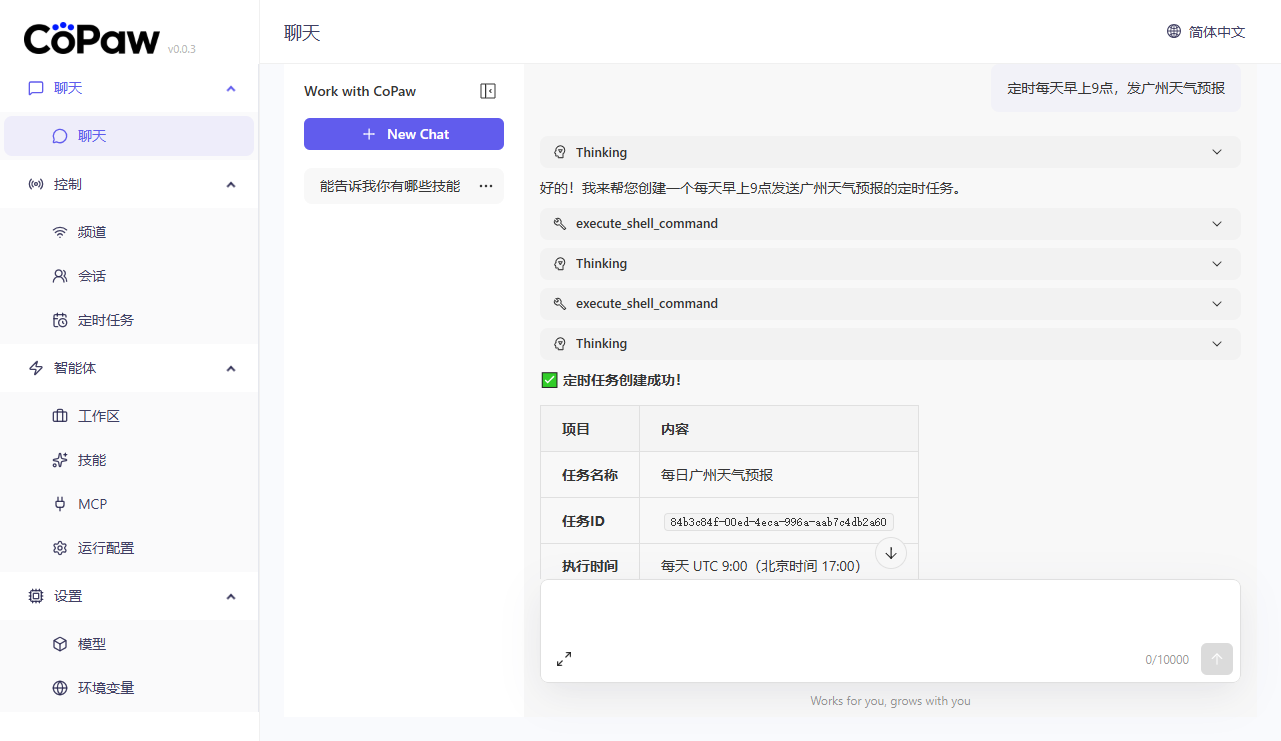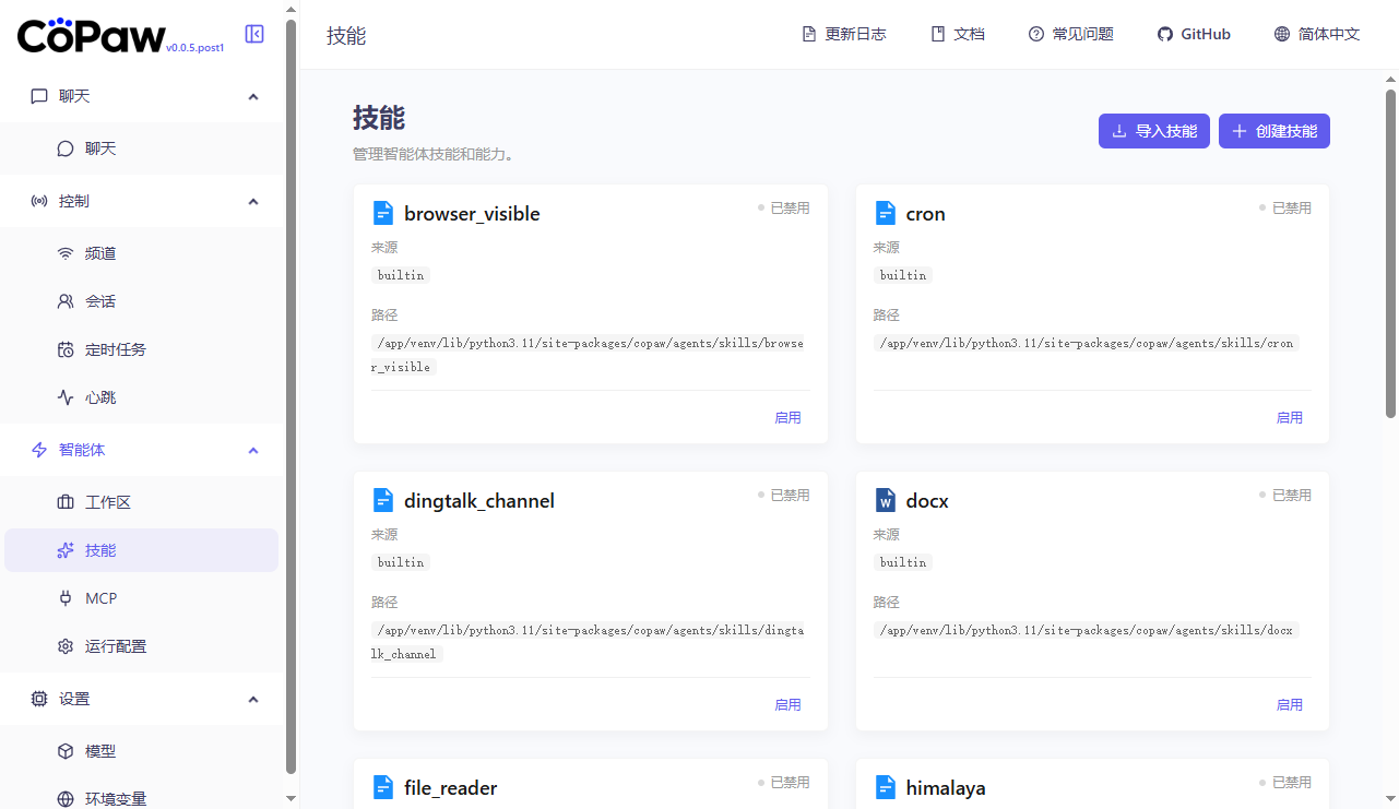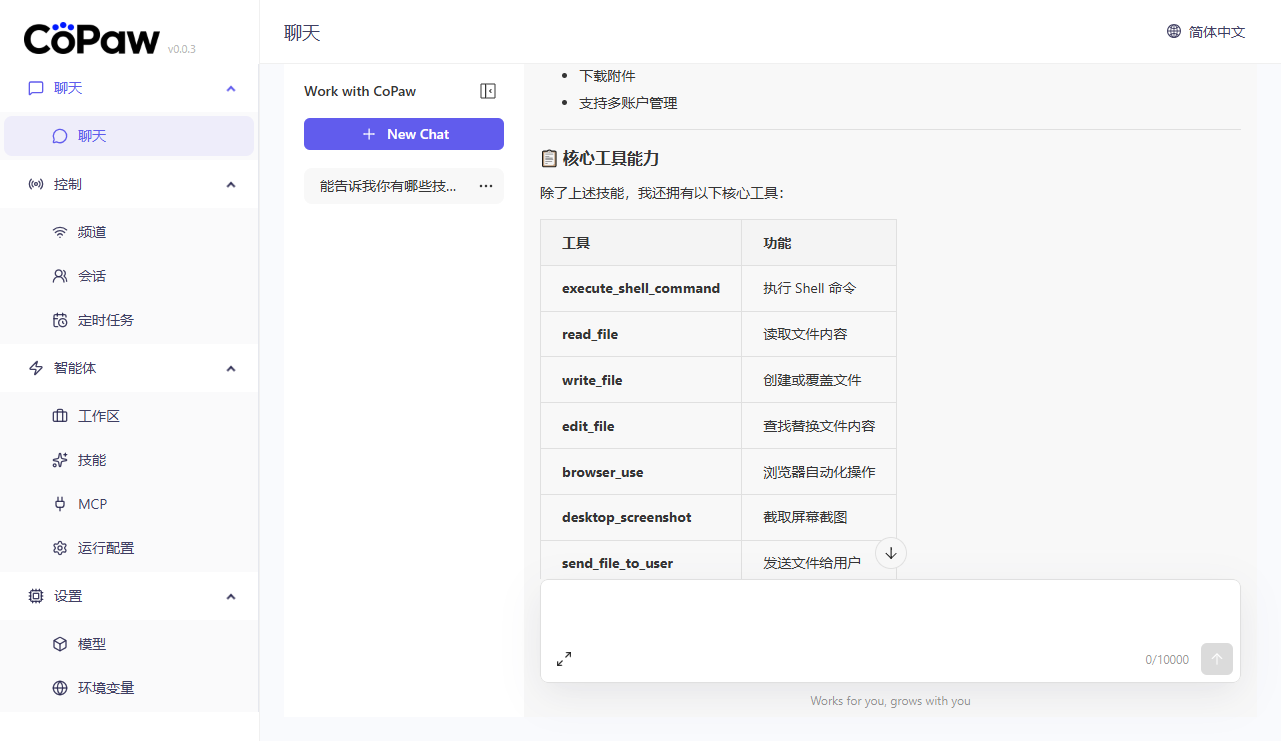 - • 能力由 Skills 决定,有无限可能 — 内置定时任务、PDF 与表单、Word/Excel/PPT 文档处理、新闻摘要、文件阅读等,还可在 Skills 中自定义扩展。