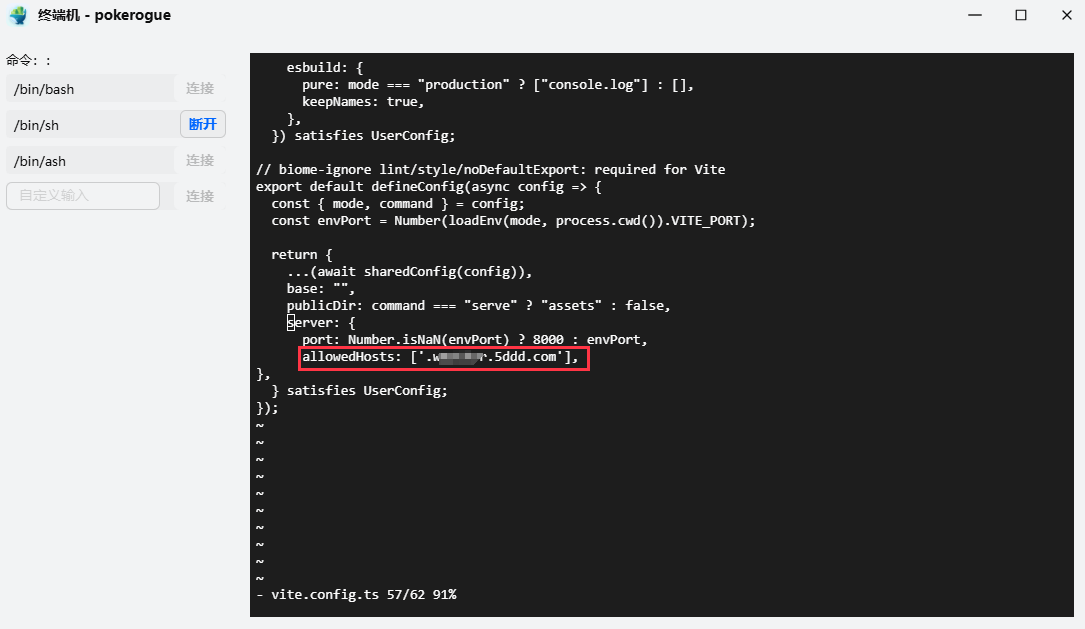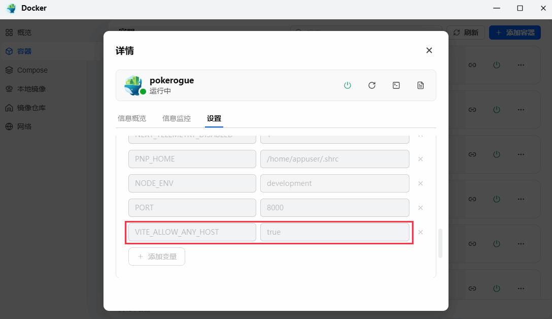 以我的fnOS中的Docker为例,构建好pokerogue容器后,需要在设置中的“环境变量”设置里添加一条变量,VITE_ALLOW_ANY_HOST = true