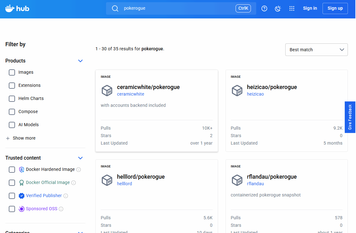 在DockerHub中搜索 pokerogue可以看到很多人上传的镜像,这里面我几乎都试了,能正常运行并且效果比较好的是 helllord/pokerogue,这个镜像也是更新最频繁的,截止到写这篇文章的时间,官方PokeRogue的版本是v1.11.14,而这个镜像的版本是v1.11.13(beta)。