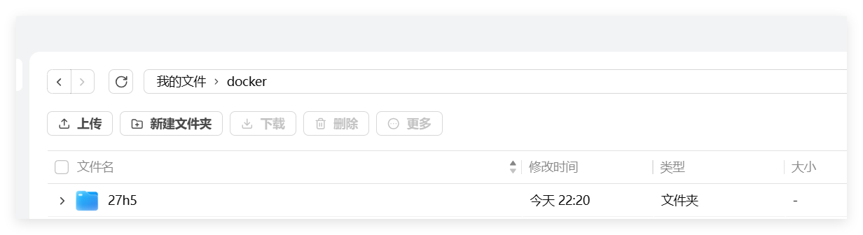 安装之前需先在 docker文件夹中新建一个 27h5文件夹,用于配置持久化保存,后面所有相关文件都存在这里。