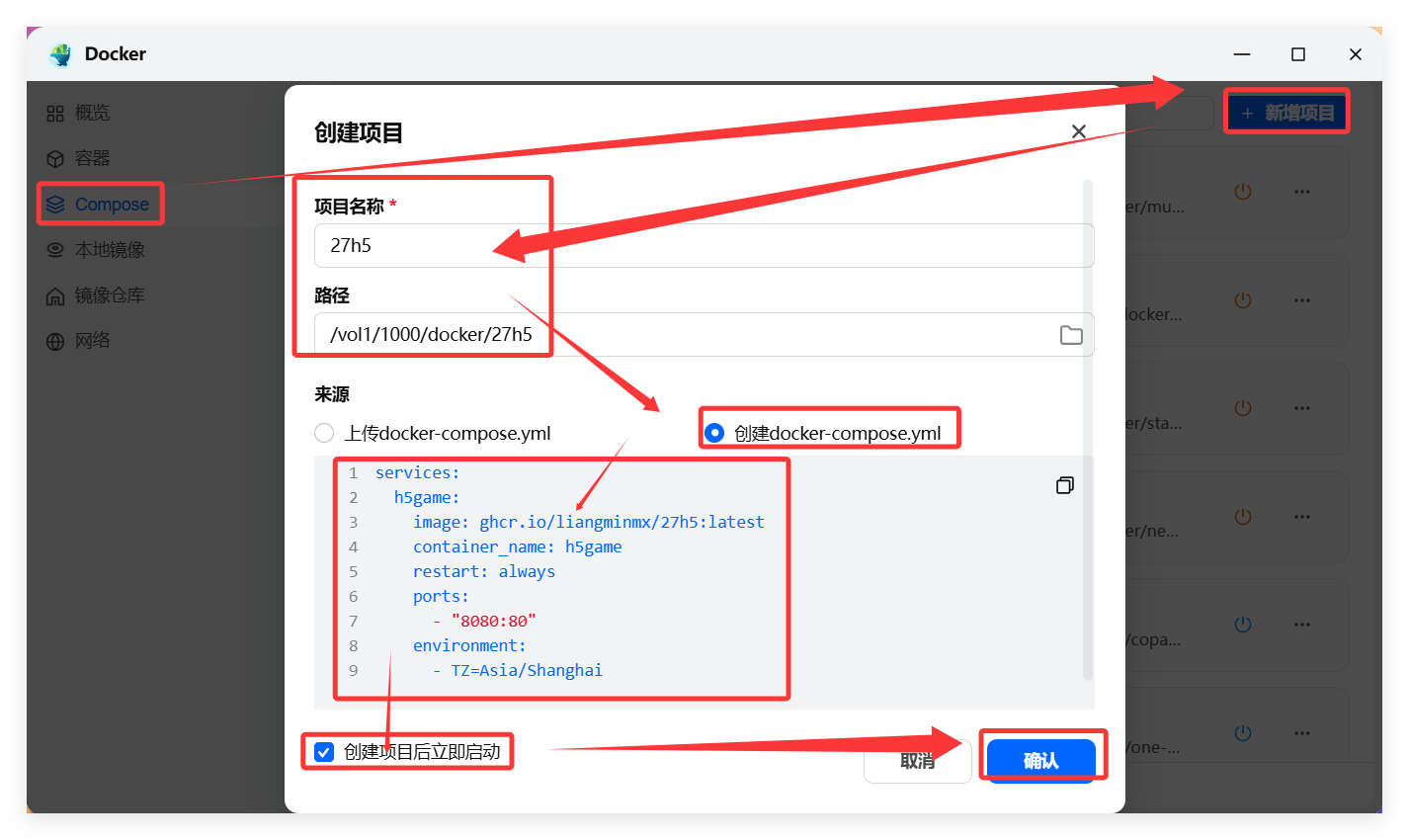 打开飞牛OS的 docker--compose--新增项目--项目名称(填 27h5,可识别即可),路径选择上面建立好的文件夹“27h5”,选择 创建docker-compose.yml,然后将下面代码复制粘贴到代码框,为了便于大家理解,我给部分代码加了注释,最后勾上 创建项目后立即启动,点击 创建即可: