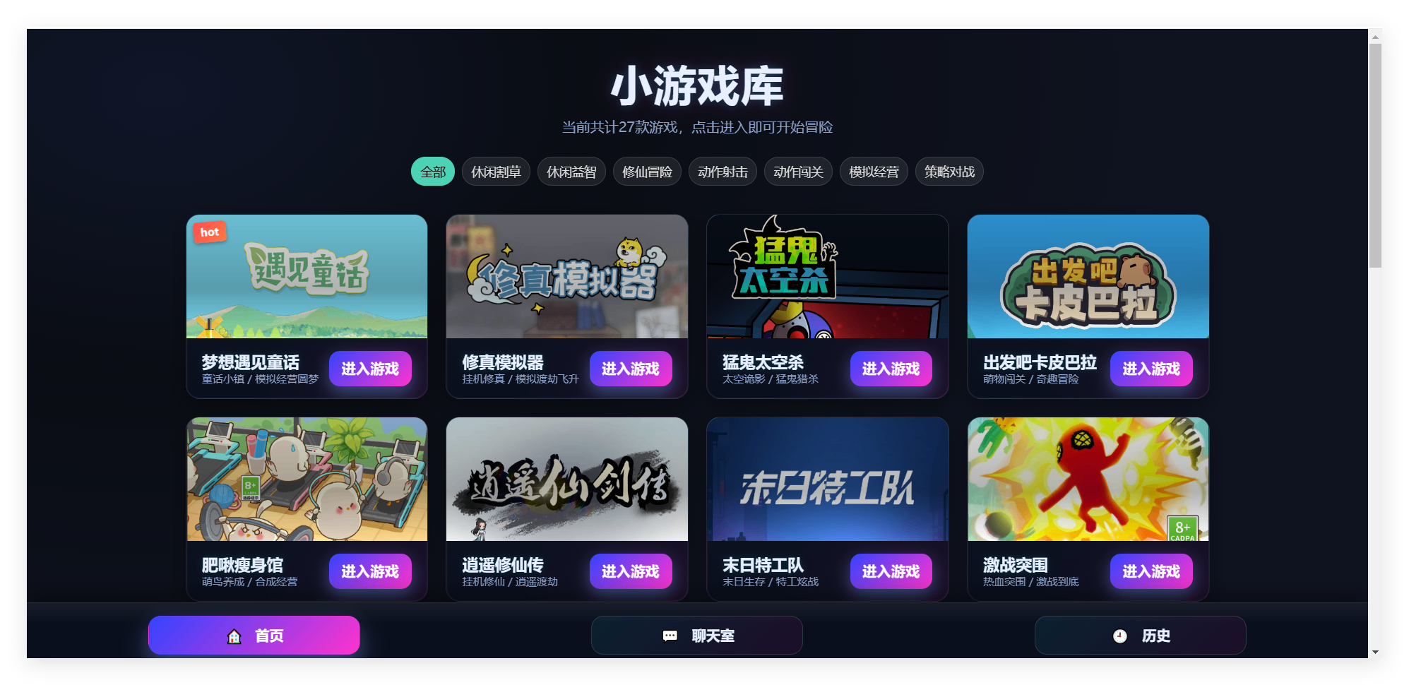 今天再给大家带来一个小游戏库,包含 27个小游戏,此游戏库由作者 echeverra收集于网上,我只是把这个小游戏库封装成了 docker容器,方便大家安装部署,由于里面有 27个非常耐玩的各种类型的纯 H5小游戏,比如修仙冒险、休闲割草、模拟经营、策略对决等游戏,所以我也把它叫做 27h5,适配手机、点击即玩还支持存档。