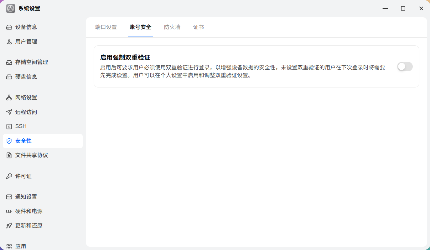 「启用强制双重验证」的位置:系统设置 > 安全性 > 账号安全 > 启用强制双重验证。开关关闭时为灰色,表示系统不会强制所有用户开启 2FA。