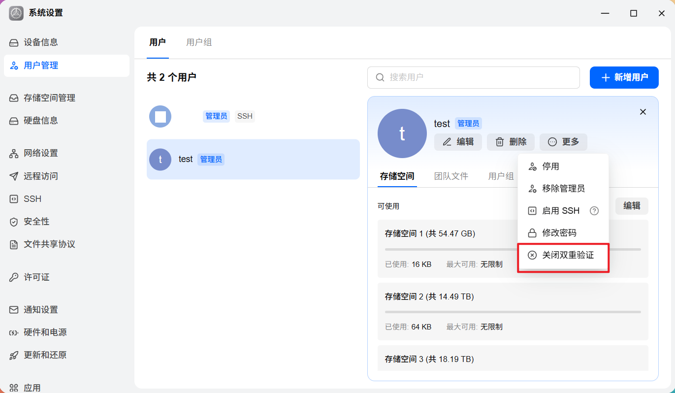 如果当前设备有多个管理员,可以联系任意一位管理员,由管理员进入「系统设置 > 用户管理」,选中无法登录的账号后,在「更多」中点击「关闭双重验证」。